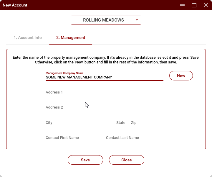 Once you have entered the account information, click on the Management tab and enter the required information there. As you type the Management Company Name, a list of matching property management companies will be shown.