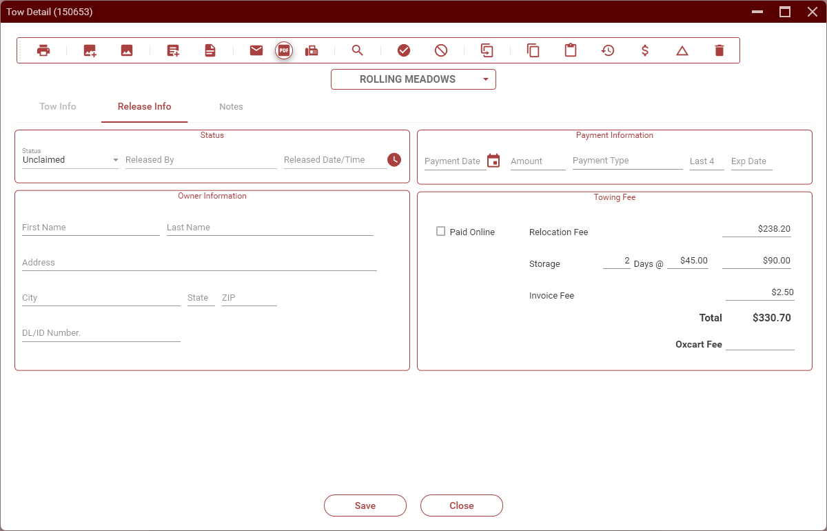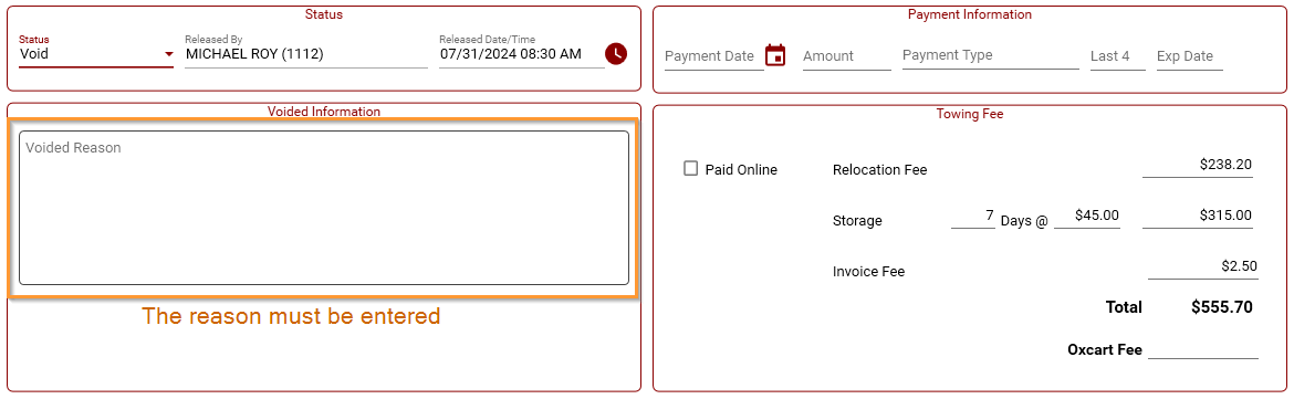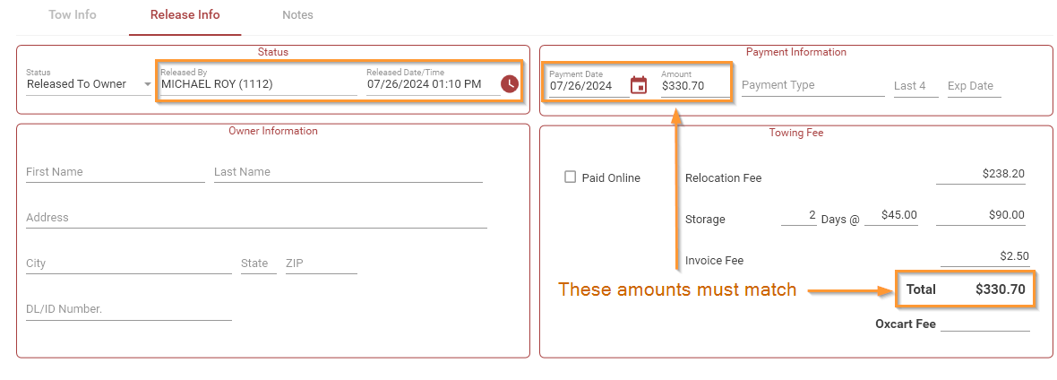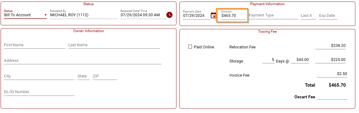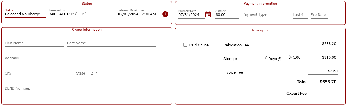 This should be used when a vehicle is released with no charge to the owner. When selected, the amount paid will be set to $0.00 automatically. No other information needs to be entered.