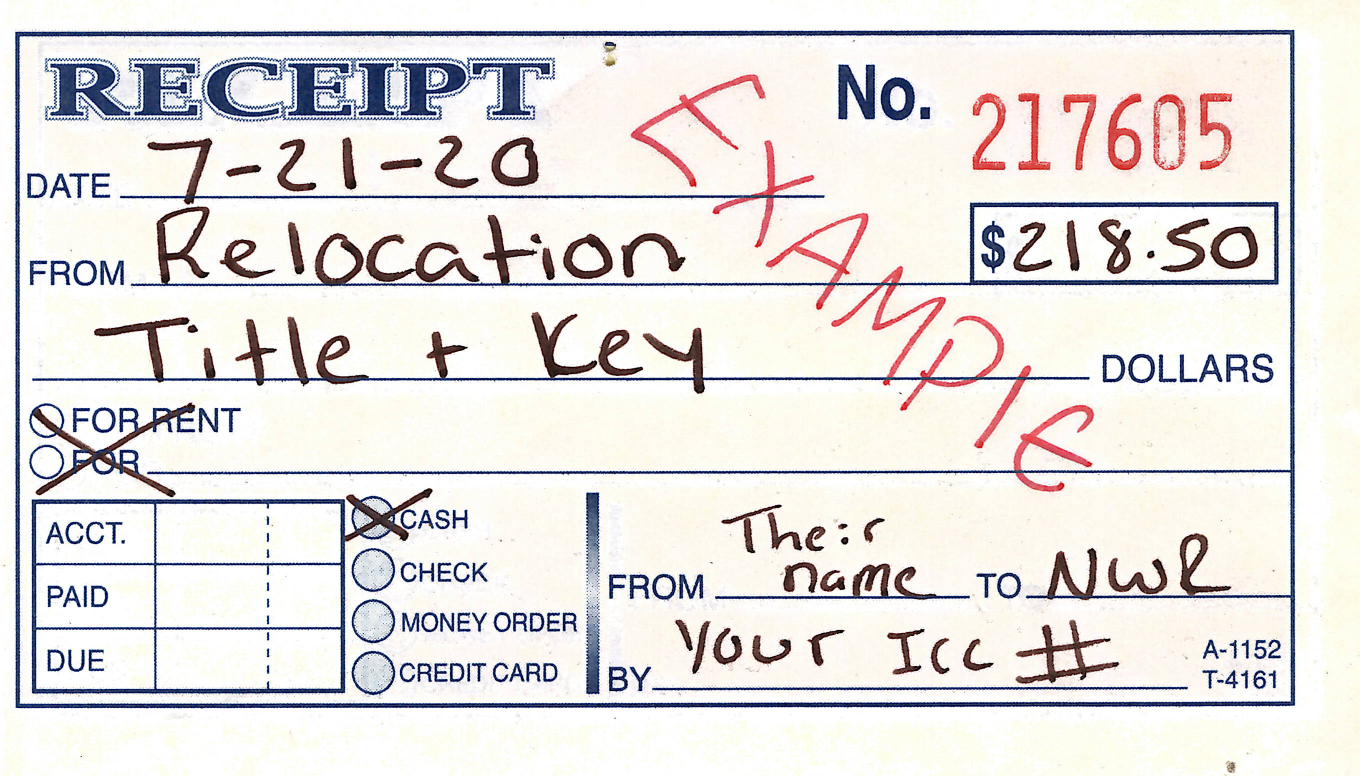 When the owner pays the towing fee, a receipt must be filled out and provided to them. Do not fill out any part of the ICC invoice, except to note "Surrendered title/keys" in the comments section.
